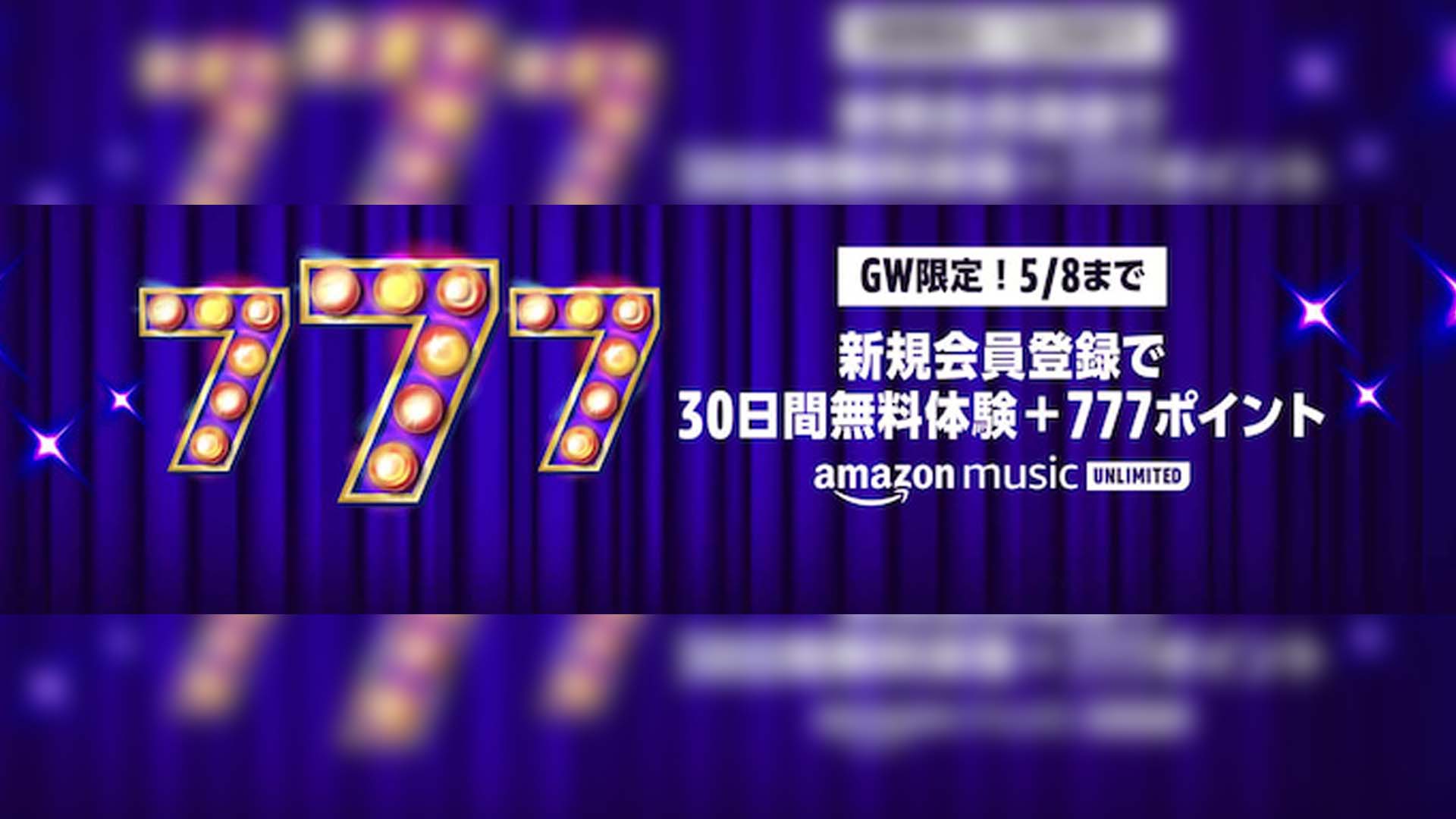GW限定で、Amazon Music Unlimited 30日間無料体験+777ポイントもらえる新規会員キャンペーンです。